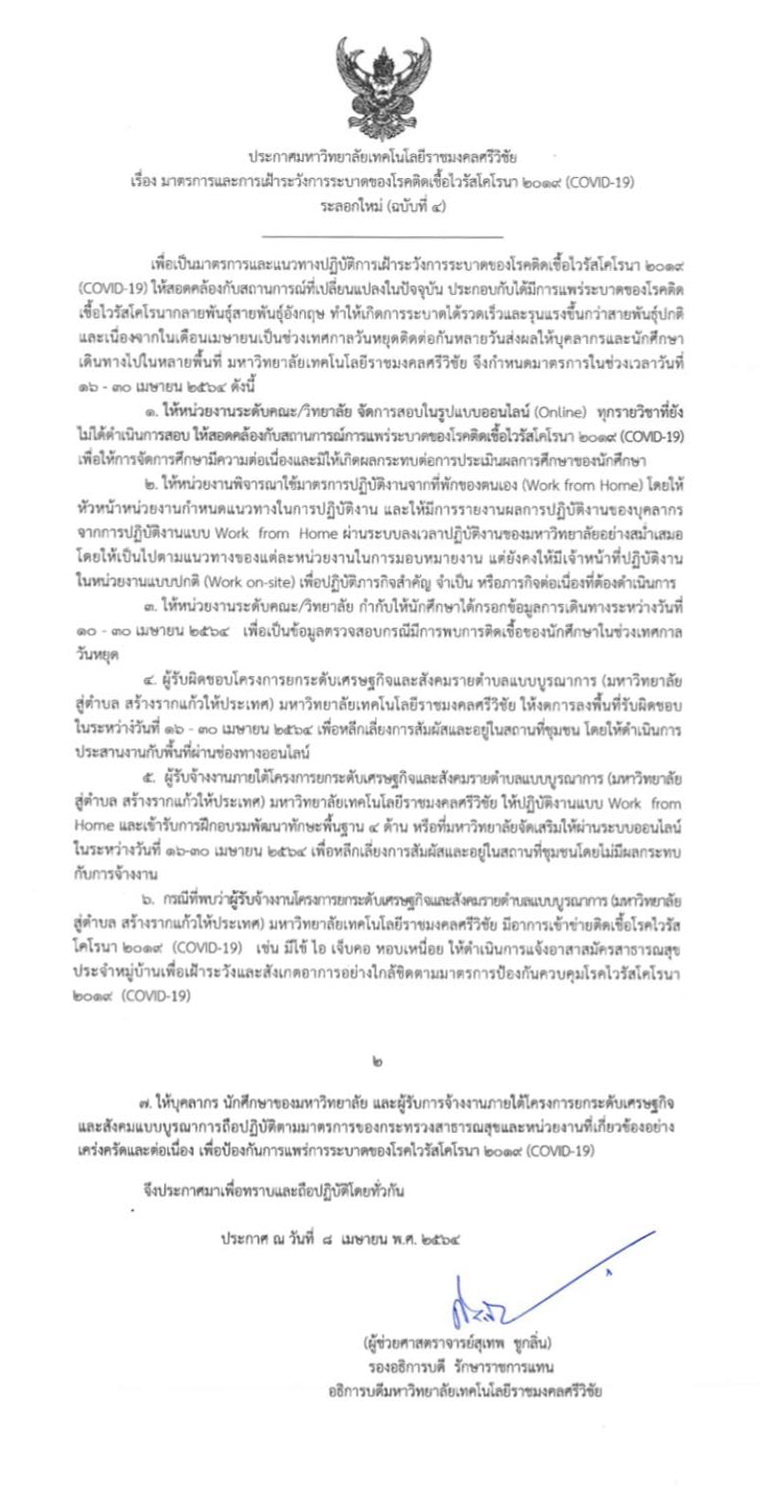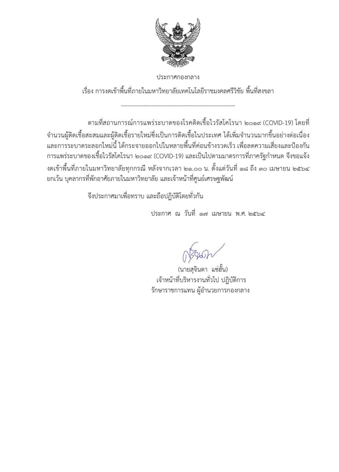 เรื่อง การงดเข้าพื้นที่ภายในมหาวิทยาลัยเทคโนโลยีราชมงคลศรีวิชัย