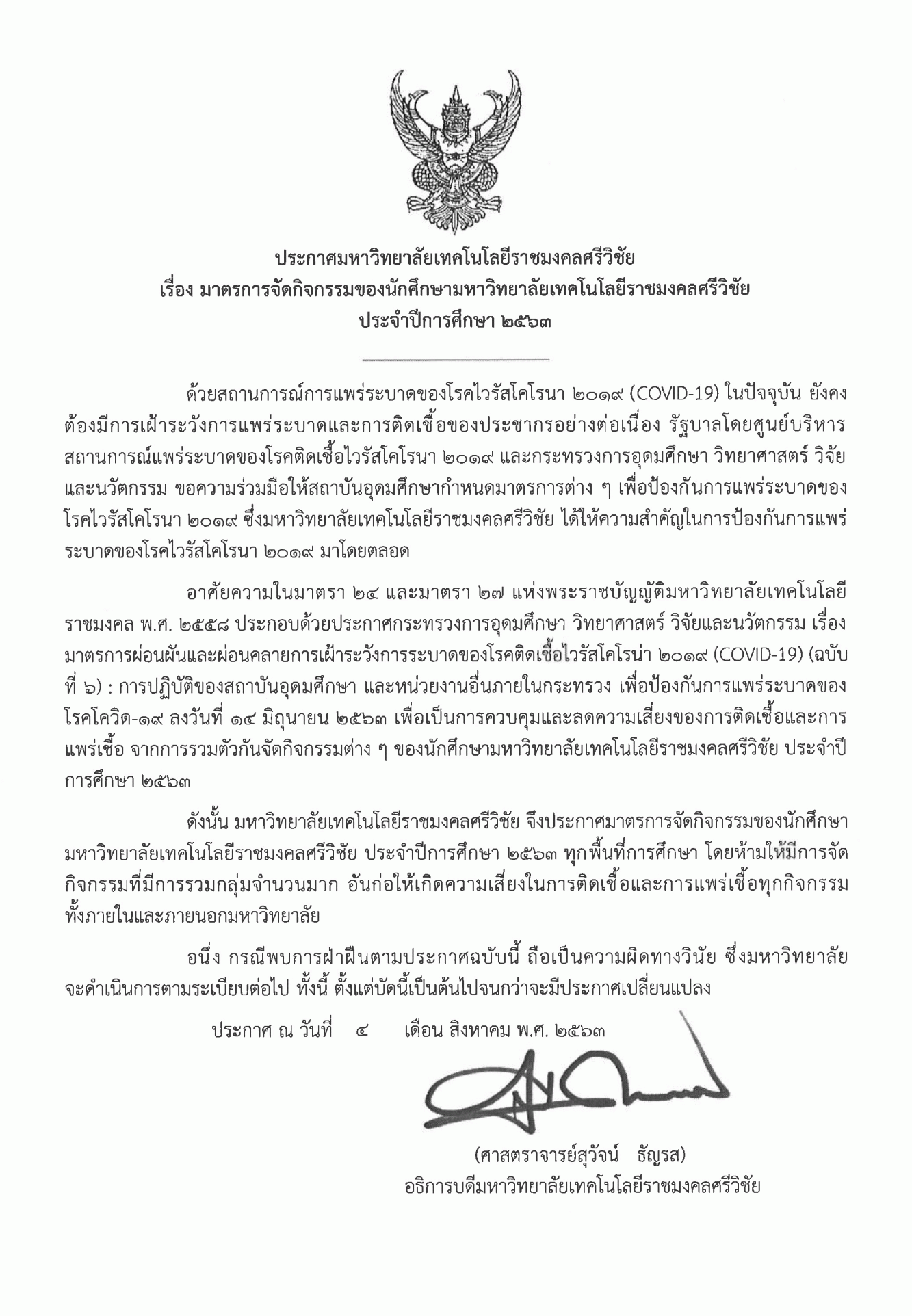 เรื่อง มาตรการจัดกิจกรรมของนักศึกษามหาวิทยาลัยเทคโนโลยีราชมงคลศรีวิชัย ประจำปีการศึกษา ๒๕๖๓