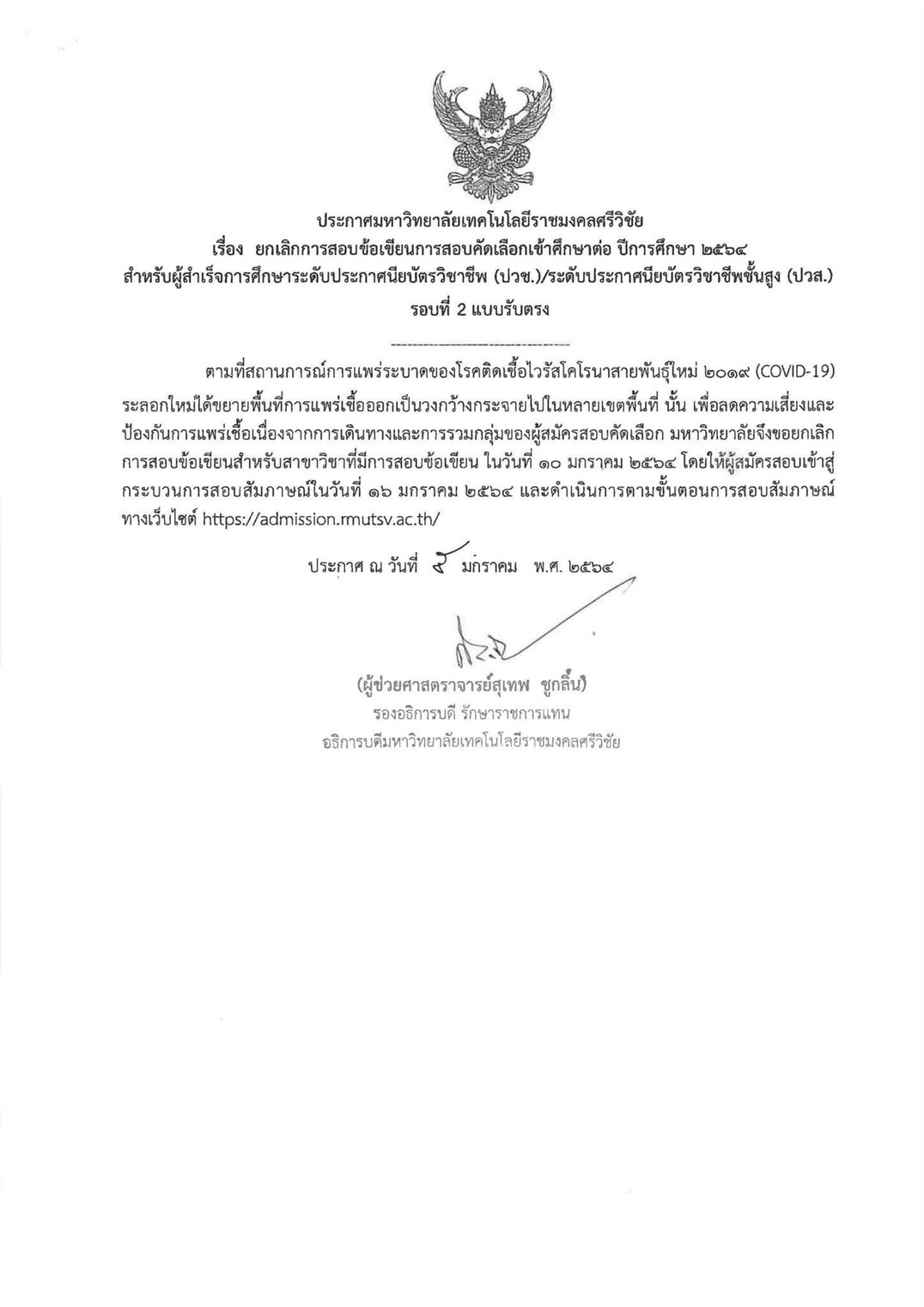 เรื่องยกเลิกการสอบข้อเขียนการสอบคัดเลือกเข้าศึกษาต่อ ปีการศึกษา ๒๕๖๔ สำหรับผู้สำเร็จการศึกษา ปวช/ปวส รอบที่ 2 แบบรับตรง