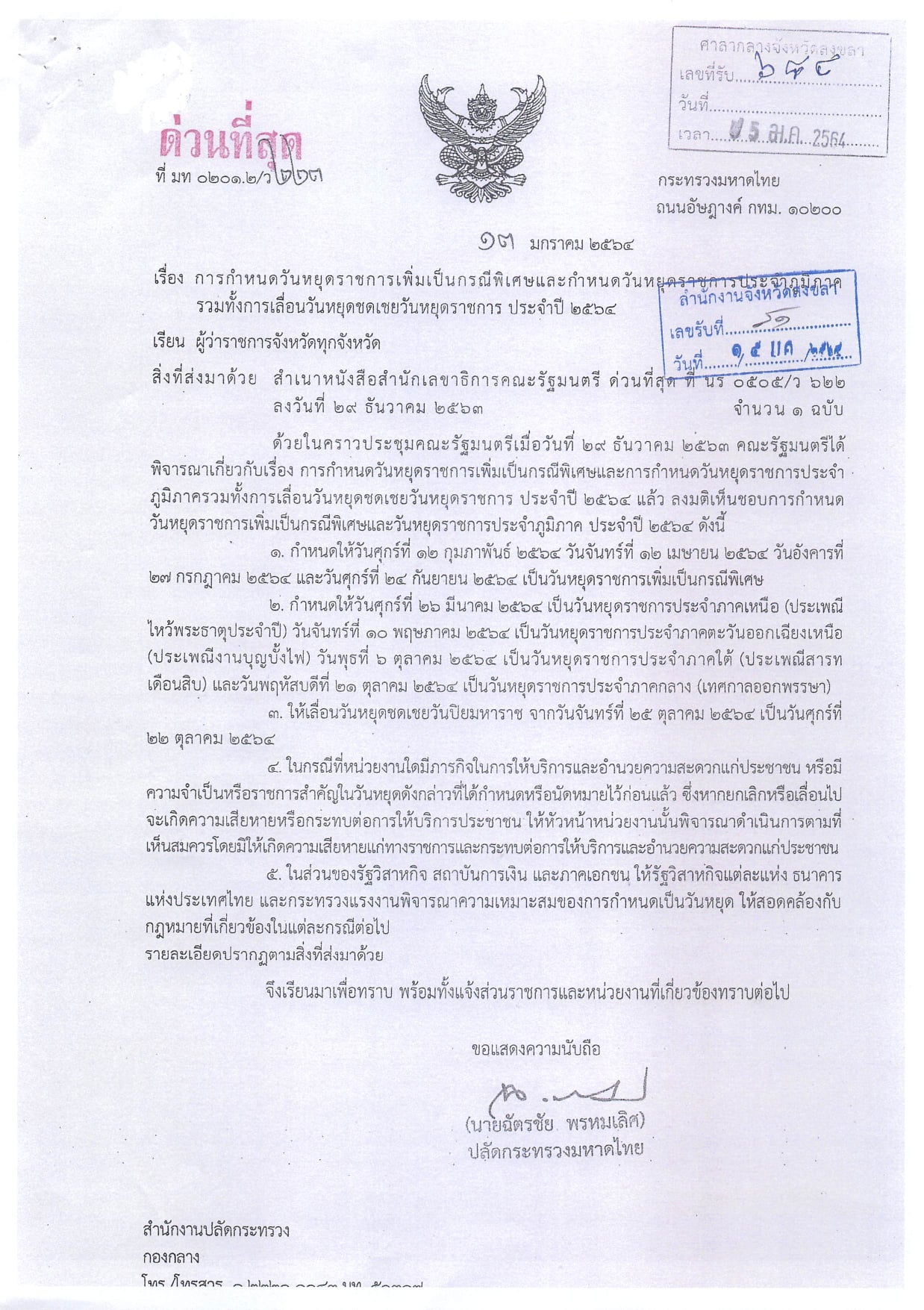 เรื่อง การกำหนดวันหยุดราชการเป็นกรณีพิเศษและกำหนดวันหยุดราชการประจำภูมิภาค รวมทั้งการเลื่อนวันหยุดชดเชยวันหยุดราชการ ประจำปี 2564